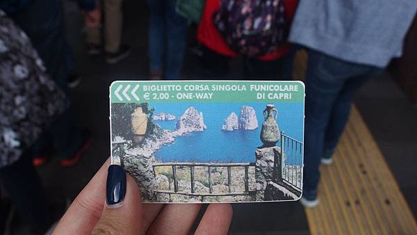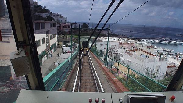 到達卡布里島,我們還要再搭纜車上山,這跟我之前去其他海島地方不同,其他海島地方就只是從另一個地方搭船到目的地,這邊還要再搭纜車上去,真的很特別,纜車搭一趟2歐元,沿途還可以欣賞風景。