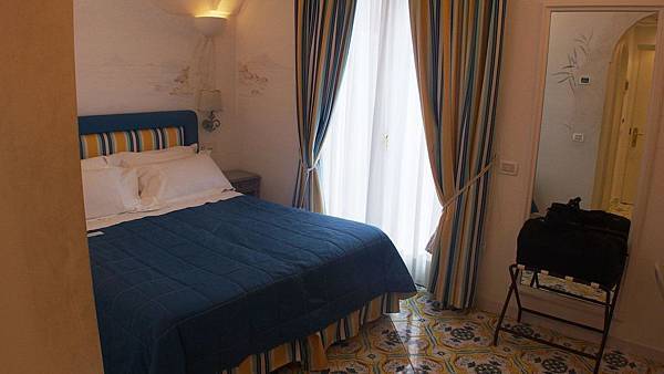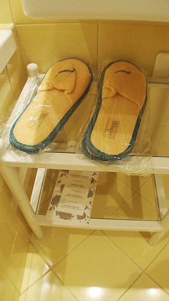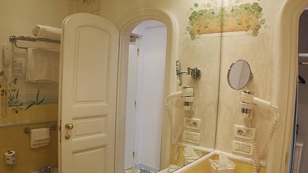 接下來是浴室的部分,裡面有浴缸、衛浴用品、吹風機,更好的是還有提供拖鞋,大部分義大利的飯店是不會提供拖鞋的,因為注重環保概念的關係,但這間有提供拖鞋這點我給一個讚。