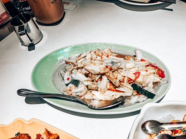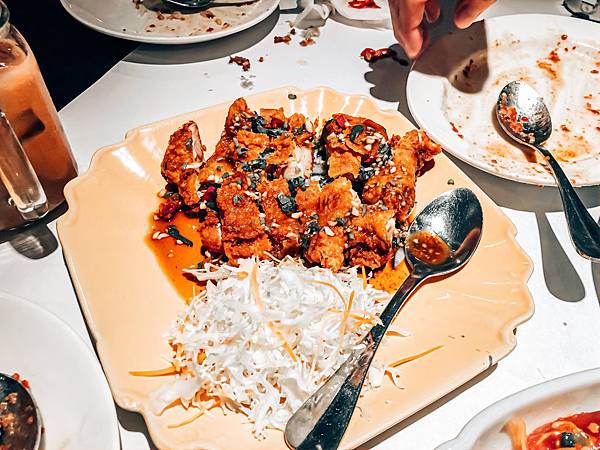 風味椒麻雞,雞肉外皮吃起來很酥脆,裡面的肉很嫩,淋上椒麻醬汁吃起來酸酸辣辣的,但辣度沒有辣炒牛肉這麼辣。